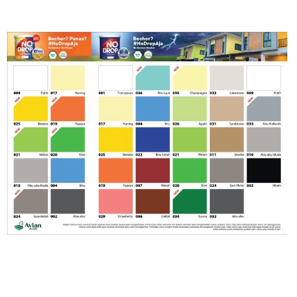 001 Transparan 002 Abu Abu (ADUKAN TINTINGAN MESIN) 003 HITAM 004 BIRU 005 HIJAU ( ADUKAN TINTING MESIN) 006 COKLAT 007 MERAH 008 ORANGE ( ADUKAN TINTING MESIN ) 009 PUTIH ADUKAN TINTINGAN 010 Abu Abu Muda ADUKAN TINTINGAN 011 MOCHA 017 KUNING 018 APRICOT ( TINTING MESIN TOKO LEBIH MAHAL WARNA TINTA MAHAL) 019 PAPAYA 020 KIWI 021 MELON 022 BIRU CERAH 024 Gun Metal 025 BANANA 026 APPLE 027 Pineapple ( TINTING MESIN TOKO LEBIH MAHAL WARNA TINTA MAHAL) 028 Pumpkin ( TINTING MESIN TOKO LEBIH MAHAL WARNA TINTA MAHAL) 029 STRAWBERRY 030 Grape ( TINTING MESIN TOKO LEBIH MAHAL WARNA TINTA MAHAL) 031 SANDSTONE 032 LAKESTONE 033 ABU VULKANIK 034 GUAVA 035 CHAMPAGNE 036 BIRU LAUT No Drop adalah cat pelapis anti bocor yang memiliki sifat elastis, kedap air serta sangat tahan cuaca sehingga sangat cocok untuk digunakan pada permukaan tembok, beton, asbes, galvanis/seng dan permukaan terakota.