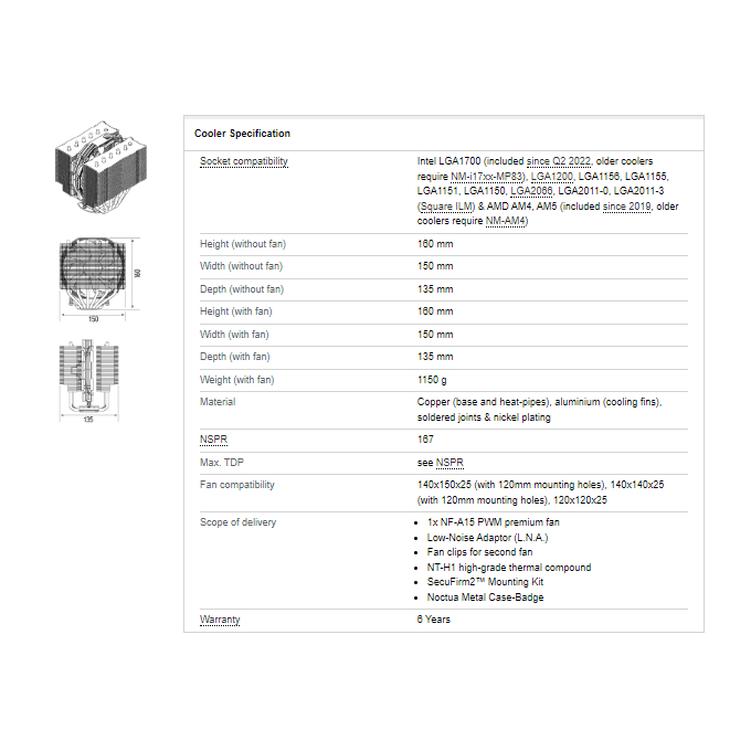 Scope of delivery - 1x NF-A15 PWM premium fan - Low-Noise Adaptor (L.N.A.) - Fan clips for second fan - NT-H1 high-grade thermal compound - SecuFirm2โข Mounting Kit - Noctua Metal Case-Badge