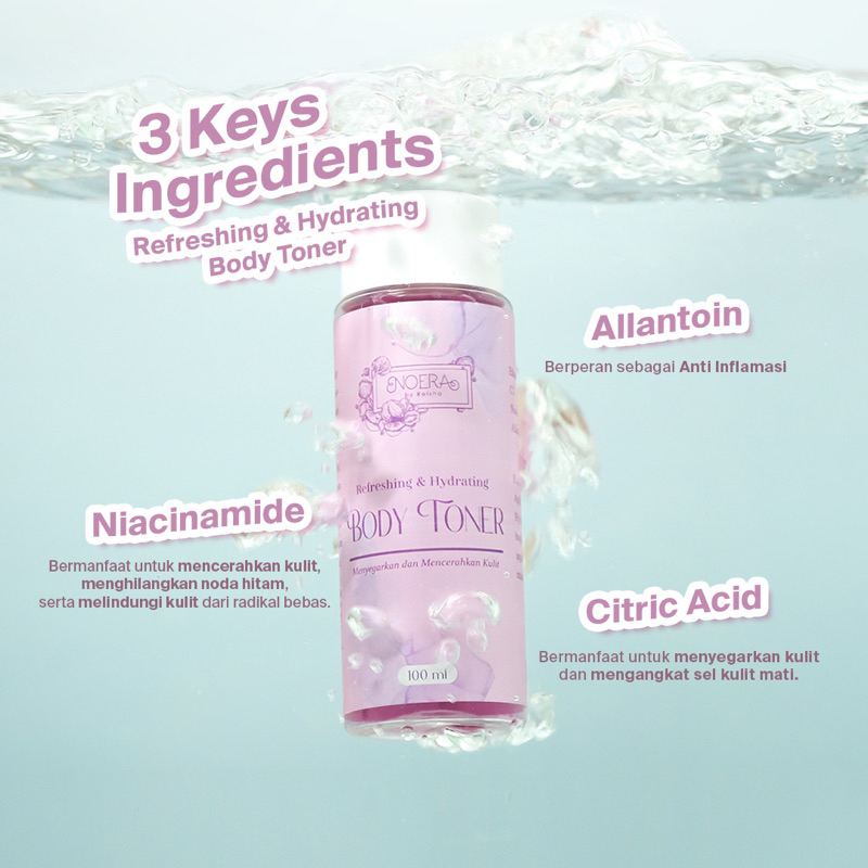Toner badan dengan kandungan Allantoin yang berperan sebagai anti inflamasi dan kandungan Niacinamide yang bermanfaat untuk mencerahkan kulit, menghilangkan noda hitam, serta melindungi kulit dari radikal bebas. Kandungan Citric Acid bermanfaat untuk menyegarkan kulit dan mengangkat sel kulit mati