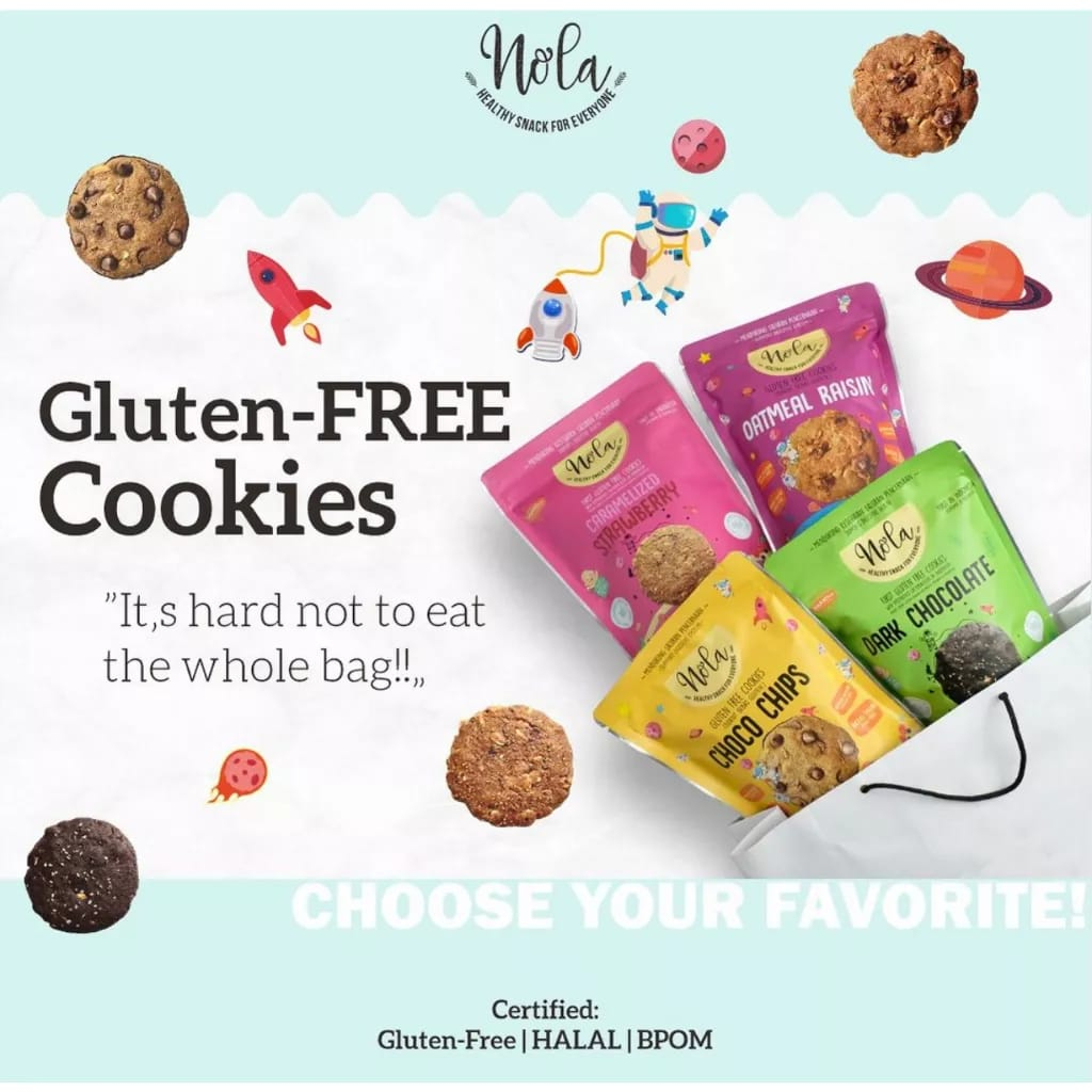 NOLA COOKIES GLUTEN FREE 75GR | SNACK BISKUIT SEHAT DIET TINGGI SERAT COOKIE BEBAS GLUTEN CHOCO CHIPS DARK CHOCOLATE STRAWBERRY OATMEAL RAISIN