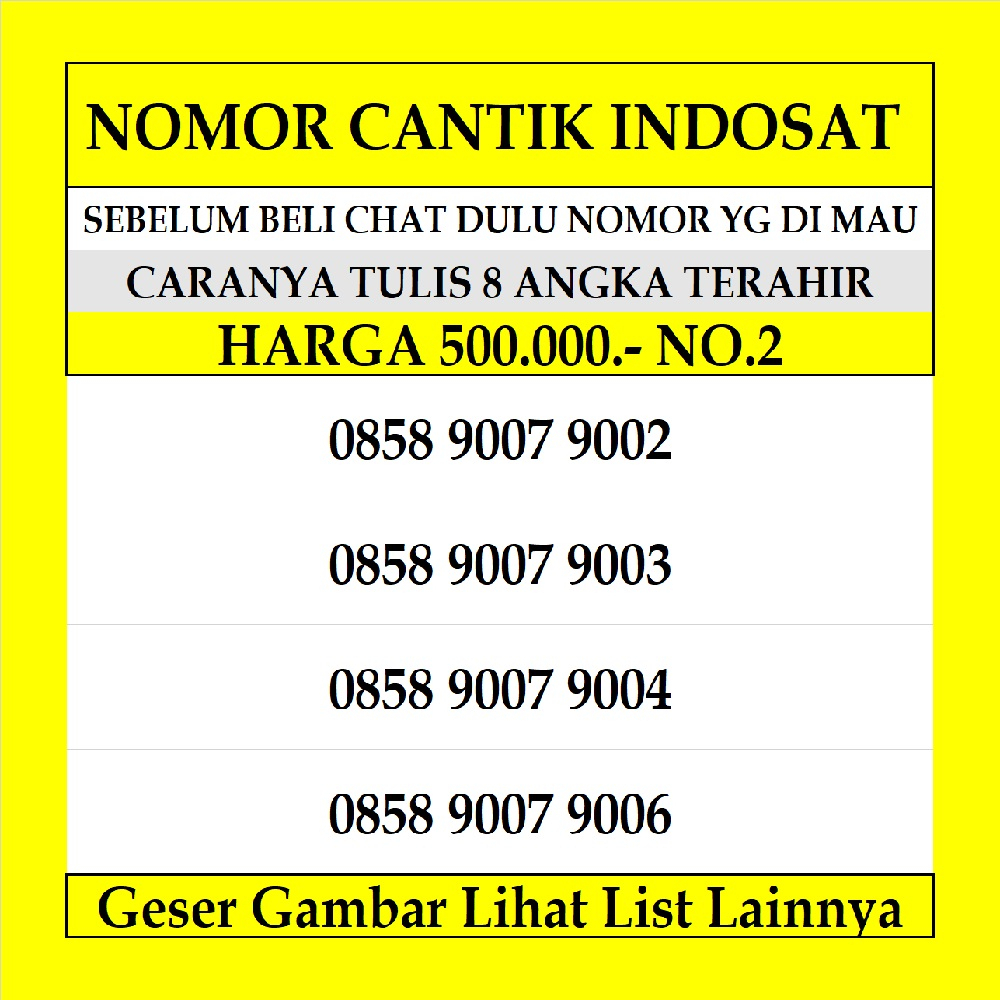 - Pilih Nomor Nya Di Gambar - Klik Gambar Lalu Geser Untuk Pilihan Nomor Cantik Lainya , - Pilih Nomor Yang Di Suka , - Ingat No List Dan Harga Sesuai List Di Gambar - Sebelum Klik Beli Tanyakan Stok Nomor Yang Akan Di Beli , - Tulis Nomornya Di keterangan Sewaktu mau Order ya - Pembeli order tanpa tanya stok dan nomor yg di order sudah terjual, maka kami akan mengirimkan nomor lain yg masih tersedia,