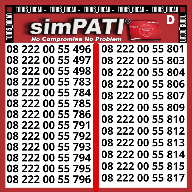 Nomor Cantik, Nomor Eklusif, Limited Edition mudah untuk di hafal dan di ingat Murah Meriah untuk kualitas Nomor berkelas ayo klik beli sekarang juga untuk memesan barang. Sebelum kehabisannn....