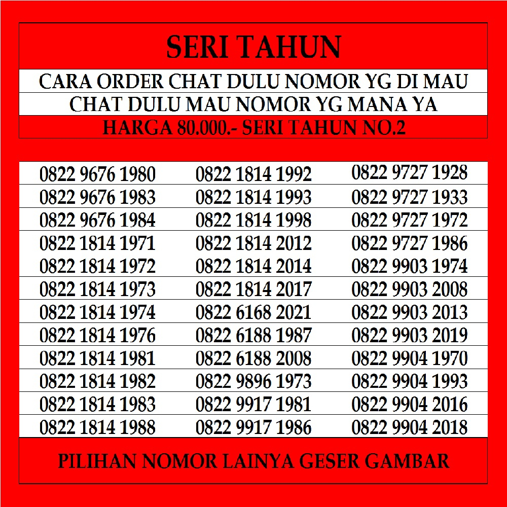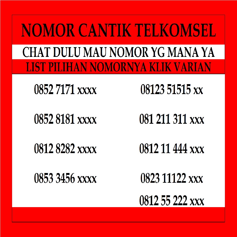 - Pilih Nomor Nya Di Gambar - Klik Gambar Lalu Geser Untuk Pilihan Nomor Cantik Lainya , - Pilih Nomor Yang Di Suka , - Ingat No List Dan Harga Sesuai List Di Gambar - Sebelum Klik Beli Tanyakan Stok Nomor Yang Akan Di Beli , - Tulis Nomornya Di keterangan Sewaktu mau Order ya - Pembeli order tanpa tanya stok dan nomor yg di order sudah terjual, maka kami akan mengirimkan nomor lain yg masih tersedia, -