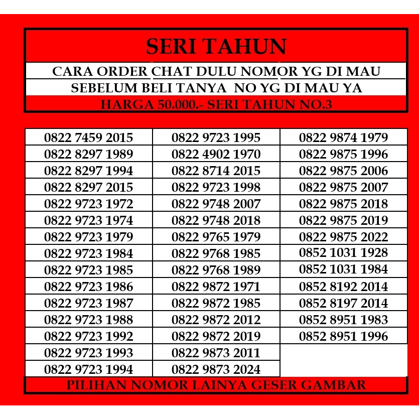 - Tanyakan Stok / List Nomor yg ready Dahulu ya !!! - Pembeli yg order tanpa tanya stok dan nomor yg di order sudah terjual, maka kami akan mengirimkan nomor lain yg masih tersedia di list - Ukuran Cip 3 in 1 (sim, micro, nano) - Dapat Digunakan Diseluruh INDONESIA - Setelah paket di terima pembeli wajib melakukan registrasi ke 4444 sesuai No NIK dan No KK pribadi