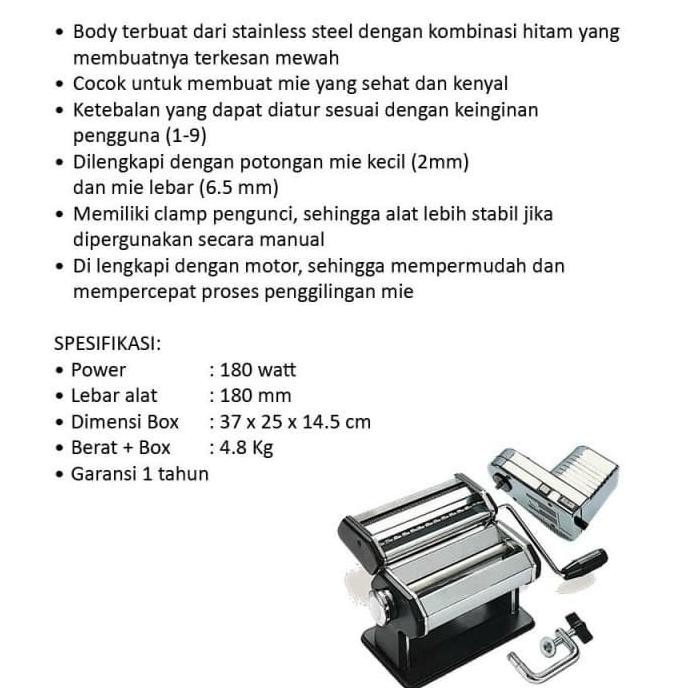 Spesifikasi: - Power : 18 watt - Memiliki diameter lebar 180 mm - Memiliki motor sebagai penggiling otomatis - Memiliki 2 fungsi : - Manual - Motor - Hasil mie yang licin dan merata