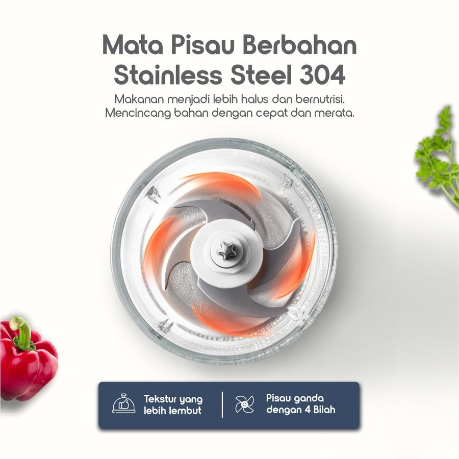Didesain dengan ukuran yang compact, dan warna tampilan yang minimalis. Mempunyai dua fungsi; sebagai food chopper, dan sebagai timbangan. Sangat cocok dibawa saat berpergian, mudah digunakan untuk membuat MPASI dan berbagai kreasi makanan.