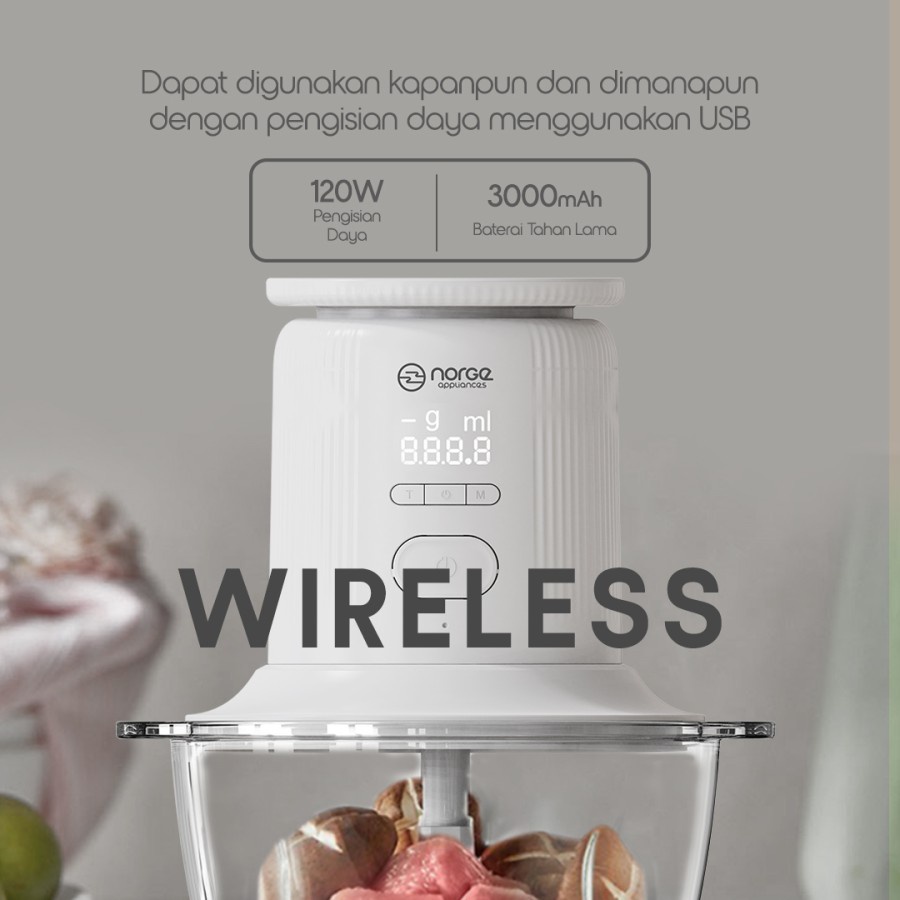 ⭐ Fitur & Benefit Norge Kitchen Scale Chopper 1.2L Wireless: - Kapasitas yang ideal, memiliki ukuran yang sempurna untuk penggunaan sehari-hari - Dua fungsi utama pada satu alat; sebagai pencincang/pemotong/penghalus bahan makanan, dan sebagai timbangan digital - Wireless, dapat digunakan kapanpun dimanapun dengan pengisian daya menggunakan USB. - Fast-charging, pengisian baterai 4 jam penuh - Daya baterai kapasitas total 3000mAh (1500x2cells). Dapat 12 kali siklus pemakaian - Tampilan elegan dengan layar LED digital, 3 tombol fungsi timbangan, dan 1 tombol fungsi pencincang - Timbangan digital dengan Tare-system; akan memberi angka 0 pada timbangan setelah mangkuk/wadah diletakkan diatas timbangan - Empat bilah mata pisau berbahan Stainless-steel-304 yang dapat dilepas-pasang dengan mudah - Wadah mangkuk/jar berbahan kaca tebal dan food-grade - Tingkat desibel kebisingan rendah saat wadah dalam keadaan kosong - Torsi mesin kuat dan stabil, Garansi Resmi 1 tahun - Lampu indikator: warna putih = baterai terisi; dan warna merah = kurang daya (jika indikator warna merah hanya menyala 5 detik itu tanda alat kelebihan beban)