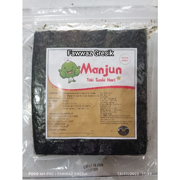 Manjun Sushi Nori Rumput Laut Kim Varian : 5 lembar, 10 lembar - HALAL - BPOM RI Penyimpanan: Tutup rapat Dalam Plastik , simpan di dalam kulkas. Manjun nori rumput laut yang dipakai untuk sushi/Kimbap Ukuran 19x20cm SIMPAN DI KULKAS UTK KRISPI LEBIH LAMA. Made in Korea