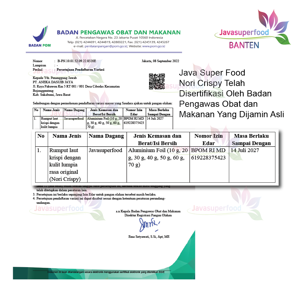 NO BPOM Nori Crispy Seaweed Snack Rumput Laut Halal Nori Crispy Java Super Food adalah Nori Crispy yang terbuat dari bahan - bahan yang berkualitas serta memiliki rasa yang enak dan lezat.