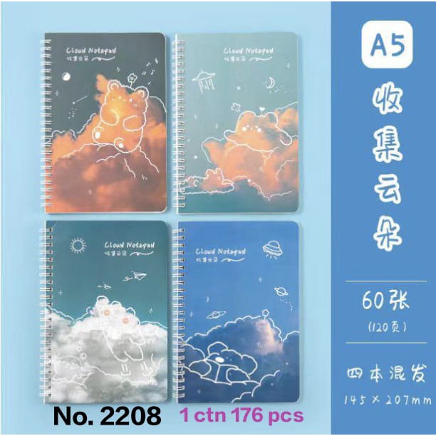 DENGAN RING: Ukuran : A5 (145MM*207MM) Isi : 60 lembar Spiral : Putih Cover depan dan belakang Motif Utama: Flower, Astronout, Cloud, Bunny