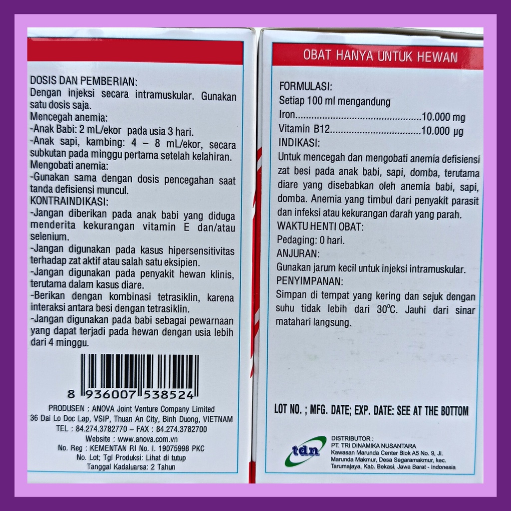 DOSIS Dengan Injeksi secara Intramuskular. Gunakan satu dosis saja Mencegah Anemia : - Anak Babi : 2 ml/ ekor pada usia 3 hari - Anak Sapi, Kambing/Domba : 4 - 8 ml/ ekor, Secara Subcutan Mengobati Anemia - Gunakan sama dengan dosis pencegahan saat tanda defisiensi muncul