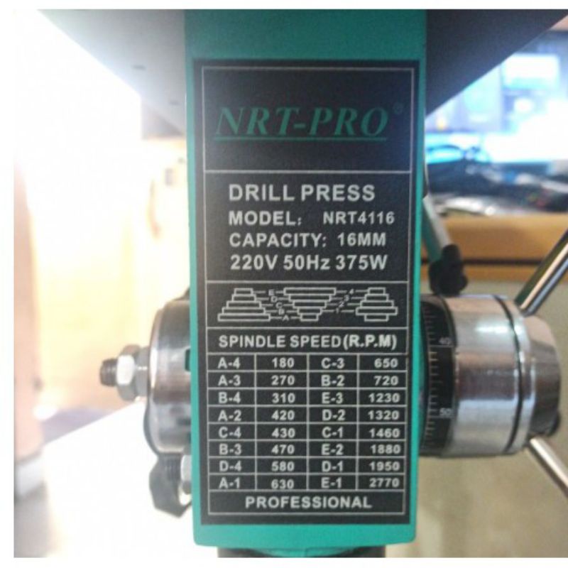 Spesifikasi : Merk : NRT-PRO Tipe : BOR DUDUK 16MM Daya : 375 Watt Listrik : 220 Volt Frekuensi : 50 Hz Ukuran : 290 x 290 mm Tinggi : 900 mm Dial of Whell : 16 mm