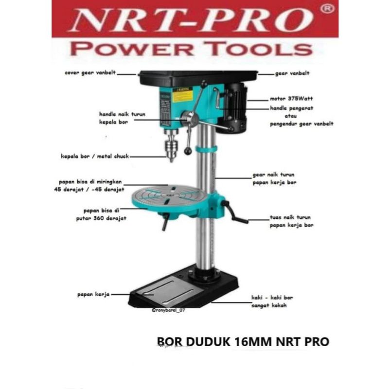 Kelebihan Mesin Bor Duduk NRT-PRO 16mm : Bench Drill Korea Quality mesin lebih bandel dan awet dan Low Watt. Hasil yg didapatkan lebih presisi, tidak mudah panas. Cat lebih halus, material lebih kuat. Mata bor maksimal 16mm, bisa untuk penggarapan kayu dan besi. Saat proses pengerjaan objek bisa ditumpuk lebih dari satu sehingga lebih mudah cepat selesai.