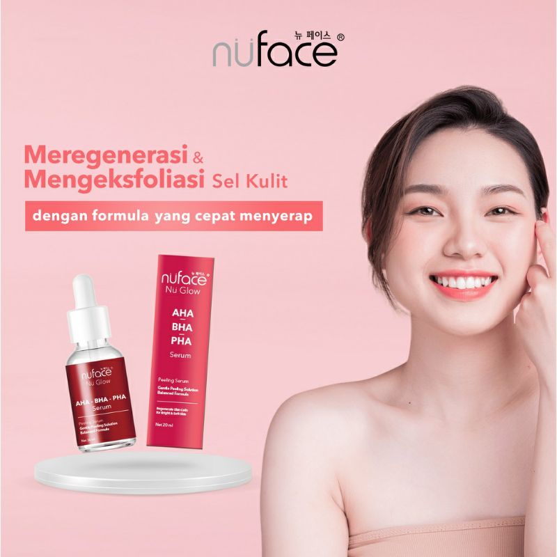 Nu Face Serum AHA BHA PHA serum wajah dengan kombinasi bahan aktif AHA, BHA, dan PHA yang membantu proses eksfoliasi sel kulit mati sehingga wajah halus dan lebih cerah merona.