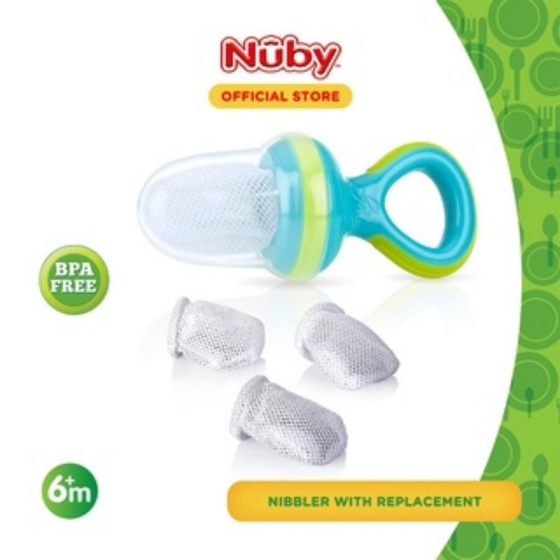 Nuby The NIBBLER adalah salah satu mesh feeder, alat untuk makan buah/sayur potong bagi bayi. Tujuannya adalah bayi berlatih makan buah/sayur potong secara langsung tanpa dihaluskan, melatih pergerakan mulut dalam mengunyah makanan yang relatif padat. Karena menggunakan jaring dari kain maka bunda tak perlu khawatir bayi tersedak karena sari-sari makanan akan melewati jaring-jaring. . Nuby The NIBBLER menggunakan mesh dari jaring kain yang bisa dilepas untuk memudahkan dalam mencuci.