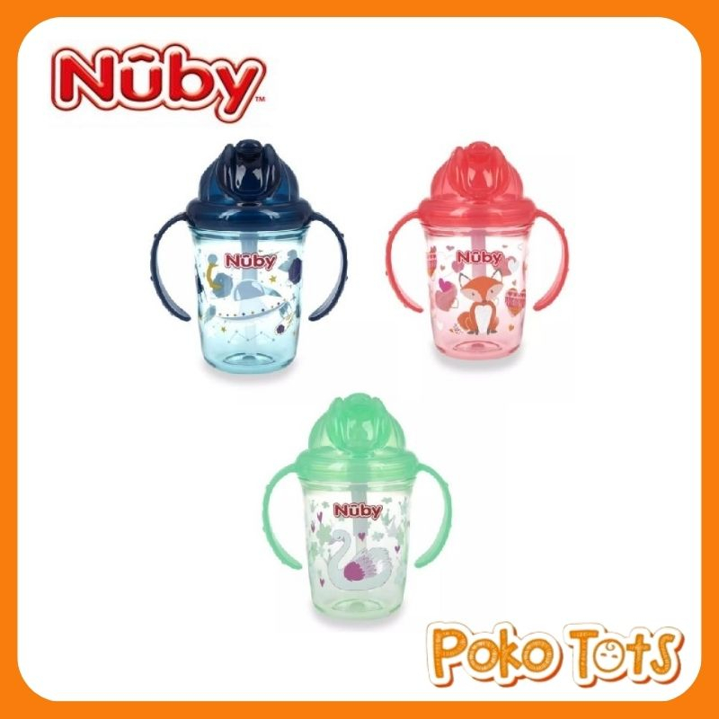 Nuby Tritan Flip It Glitter Twin Handle With Straw Tritan from Eastman Usia: 12m+ Kapasitas: 240ml BPA FREE No Spill Valve Soft Flex Silicone Ujung sedotan mempunyai bandul pemberat Designed in the USA
