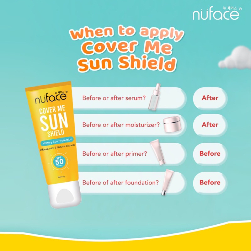 Urutan pakai: 1.Bersihkan wajah dengan nuface facial wash 2.Gunakan nuface nu glow toner sebagai penyegar 3.Gunakan nu glow serum 4.Gunakan moisturizer/ pelembab 5.Gunakan Nuface Cover Me Sun Shield 15-30 menit sebelum beraktivitas