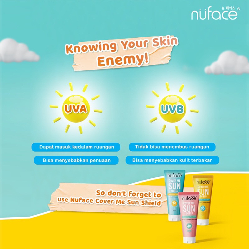 - PINK Nuface Cover Me Sun Shield Tone Up SPF 30 PA+++ Nuface Cover Me Sun Shield adalah produk Sunscreen dari Nuface yang diperkaya dengan 5 ekstrak alami dan texture yang terasa ringan dan cepat meresap di wajah, dengan fungsi melindungi kulit dari paparan buruk sinar UV A, B dan blue light yang dihasilkan dari penggunaan gadget, melembapkan, menutrisisi kulit sehingga aman dan nyaman saat beraktifitas sehari-hari di dalam ataupun luar ruangan. Ingredient: INFUSED WITH 5 NATURAL EXTRACT, NIACINAMIDE & VIT E