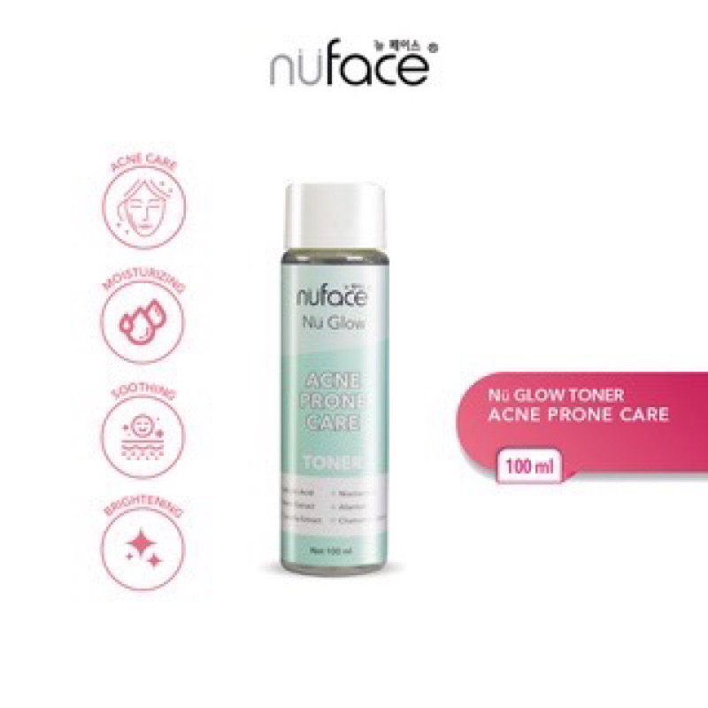 *Nu face Nu Glow Acne Prone Care Toner dengan kandungan Salicylid acid,Allantoin,ekstrak Neem,Chamomile,dan Centella untuk membersihkan dan menyegarkan kulit berjerawat. Di lengkapi dengan Niacinamide membuat kulit tampak cerah,serta kandungan minyak zaitun dan safflower untuik menjaga kelembapan dan elastisitas kulit.