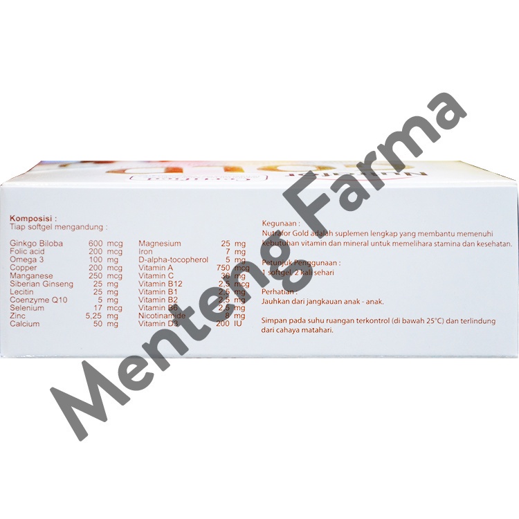 Nutrafor Gold mengandung 22 bahan aktif yang mencakup vitamin, mineral, Omega 3, Coenzyme Q10, dan Lecitin membantu menjaga stamina dan kesehtan tubuh. Mikronutrien vitamin dan mineral baik untuk proses metabolisme tubuh dan Siberian Ginseng membantu menjaga stamina tubuh