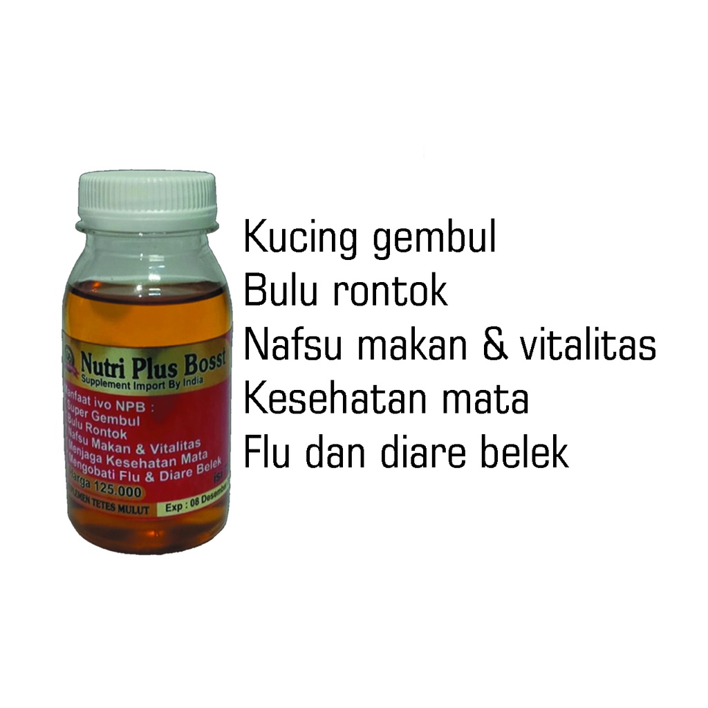 Nutri Plus Bosst adalah vitamin / suplemen yang diimport dari India berfungsi untuk : - Menjadikan kucing super gembul - Memperbaiki bulu kucing rontok - Menambah nafsu makan dan fitalitas - Menjaga kesehatan mata - Mengobati flu dan diare belek