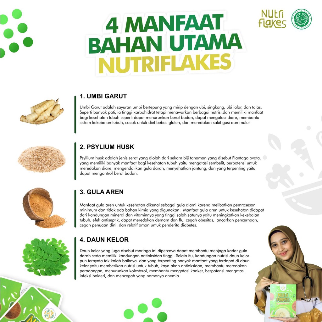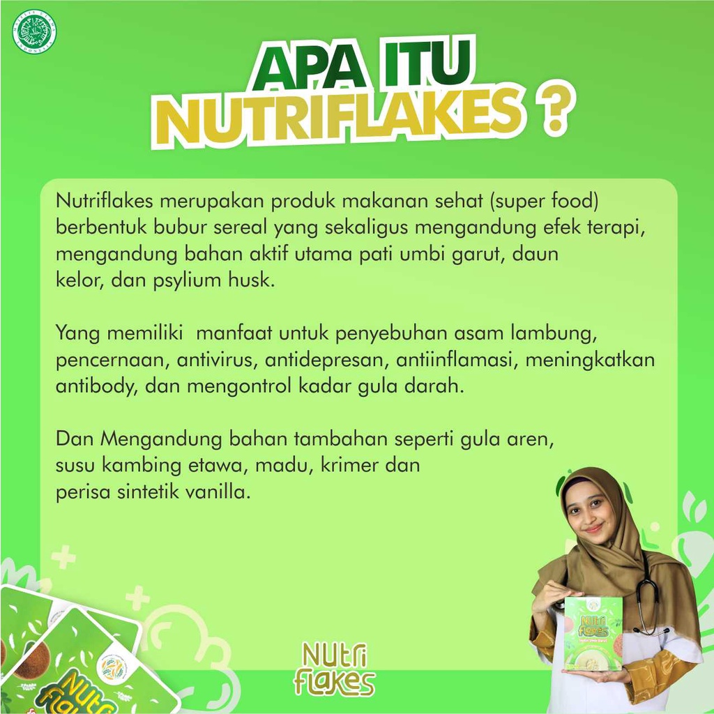 Nutriflakes merupakan produk makanan sehat (super food) berbentuk bubur sereal yang sekaligus mengandung efek terapi, mengandung bahan aktif utama pati umbi garut, daun kelor, dan psylium husk. Yang memiliki manfaat untuk penyebuhan asam lambung, pencernaan, antivirus, antidepresan, antiinflamasi, meningkatkan antibody, dan mengontrol kadar gula darah. Mengandung bahan tambahn seperti gula aren, susu kambing etawa, madu, krimer dan perisa sintetik vanilla sehingga membuat kombinasi menjadi sempurna.