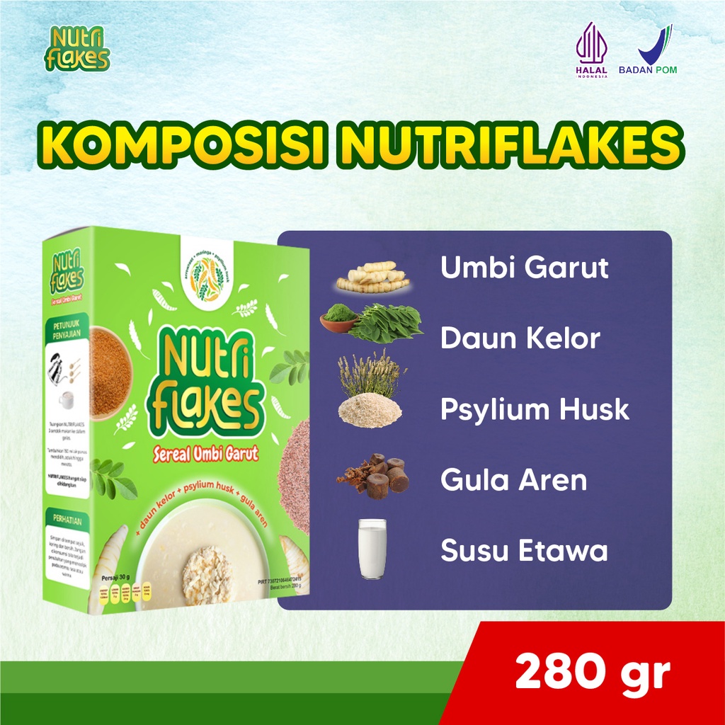 Nutriflakes merupakan produk makanan sehat (super food) berbentuk bubur sereal yang sekaligus mengandung efek terapi, mengandung bahan aktif utama pati umbi garut, daun kelor, dan psylium husk. Yang memiliki manfaat untuk penyebuhan asam lambung, pencernaan, antivirus, antidepresan, antiinflamasi, meningkatkan antibody, dan mengontrol kadar gula darah. Mengandung bahan tambahn seperti gula aren, susu kambing etawa, madu, krimer dan perisa sintetik vanilla sehingga membuat kombinasi menjadi sempurna.