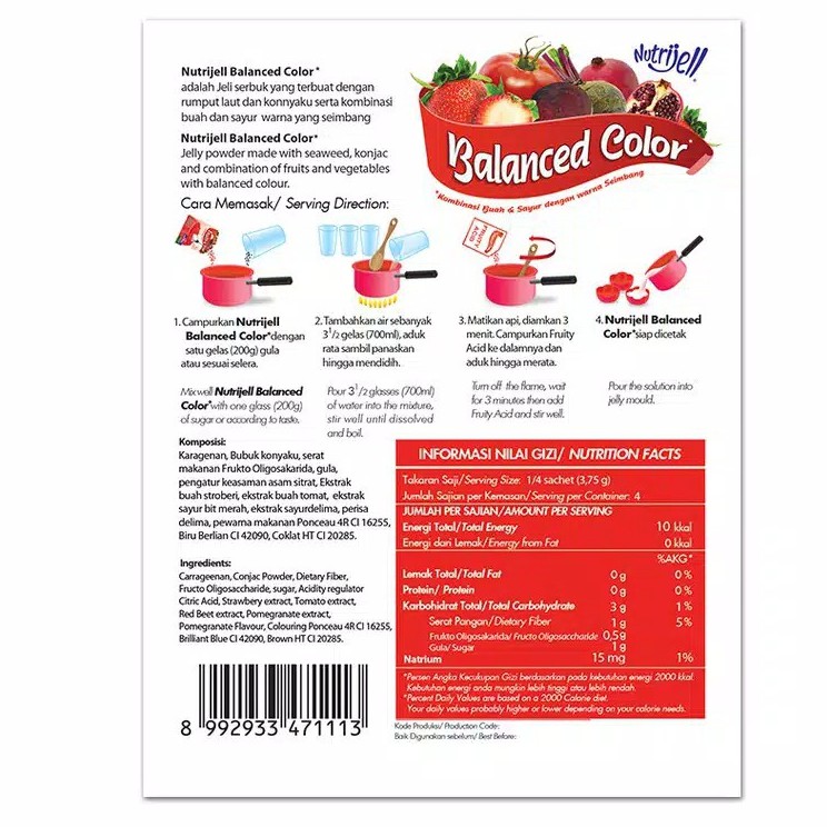 Nutrijell Balanced Color Blueberry Terdiri dari Kombinasi Rasa( Blueberry, Anggur , Kol Ungu & wortel ungu) Nutrijell Balanced Color Delima Terdiri dari Kombinasi Rasa (Delima , Stroberi, Tomat & Bit Merah ) Nutrijell Balanced Color Sirsak Terdiri dari Kombinasi Rasa (Sirsak, Leci, Asparagus & Buah Naga)