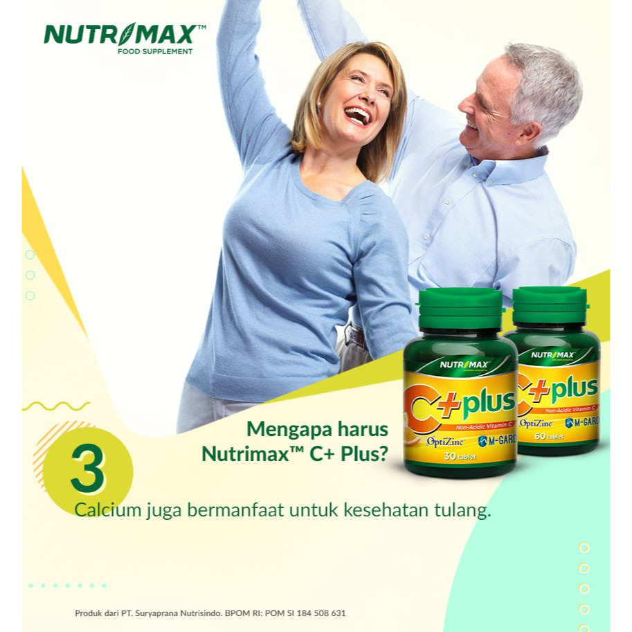 Nutrimax C+ Plus merupakan kombinasi sinergis Calcium Ascorbate (Vitamin C bebas asam), Bioflavonoid Kalsium, OptiZinc Plus Beta 1.3 & 1.6 Glukan untuk mengoptimalkan sistem pertahanan tubuh terhadap penyakit dan infeksi serta anti tumor dan kanker.