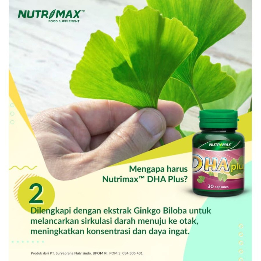 Nutrimax DHA Plus merupakan sumber DHA sebagai nutrisi otak yang aman dikonsumsi. Juga dilengkapi dengan Ginkgo Biloba Extract dan Phosphatidylserine yang bekerja sinergis untuk melancarkan sirkulasi darah yang membawa nutrisi dan oksigen untuk mengoptimalkan fungsi otak, mata dan sistem saraf.