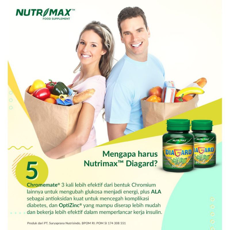 Nutrimax Diagard mengkombinasikan herbal dan mineral penting yang bekerja secara lengkap untuk menormalkan gula darah. Mengandung Gymnema Sylvestre, Bitter Melon, Tinospora Crispa, Chromemate, Optizinc dan ALA. Nutrimax Diagard bekerja menghambat penyerapan gula di usus, meningkatkan produksi & kerja insulin, mencegah kerusakan pankreas serta sebagai antioksidan untuk meningkatkan sensitivitas reseptor insulin.