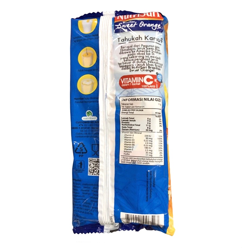 Nutrisari Orange Minuman Serbuk 10 Sachet merupakan minuman serbuk dari sari buah jeruk Brazil alami. Memenuhi 100% kebutuhan vitamin C, diperkaya dengan vitamin A, B1, B3, B6, asam folat dan E, serta mineral kalsium dan fosfor. Diolah dengan teknologi granulasi dan enkapsulasi agar kualitas produk tetap terjaga. Fitur Produk