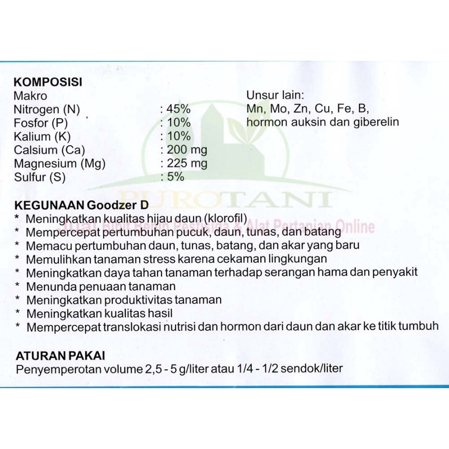 Aturan pakai GOODZER D -Penyemprotan volume 2.5 gram/ liter atau 1/4 sampai 1/2 sendok/liter. ISI 500 GR PRODUKSI CV TRAH AGRO MANDIRI