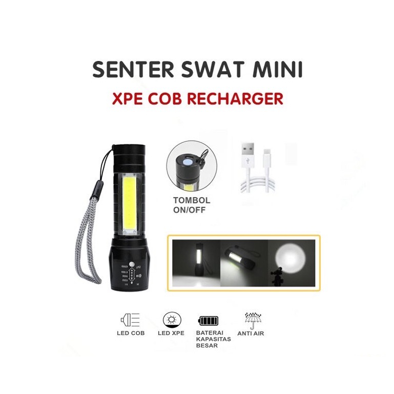 Mini Senter Swat COB . Dapat Diisi Ulang Tanpa Baterai Karena Sudah Di Tanam Baterainya . Di Lengkapi Box Plastik Militer , Kabel Charger Universal , Klip Penjepit Untuk Saku . Bahan Full Alumunium Alloy , Bukan Sembarangan Bahan . Alumunium Senter Ini Terjamin Kokoh Dan Tidak Ringkih . Senter Sangat Terang Untuk Ukuran Sekecil Ini . Best Product .... Cocok Untuk Semua Orang .