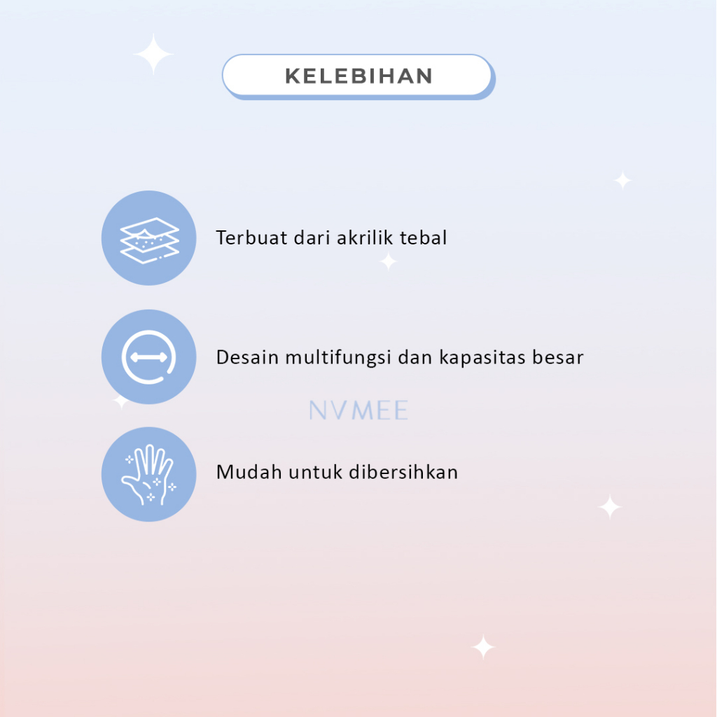 SPESIFIKASI β¦ Bahan : Acrylic PET+PP β¦ Ukuran Produk : - 2 Tingkat : 11x13x8cm - 3 Tingkat : 11x18.5x8cm