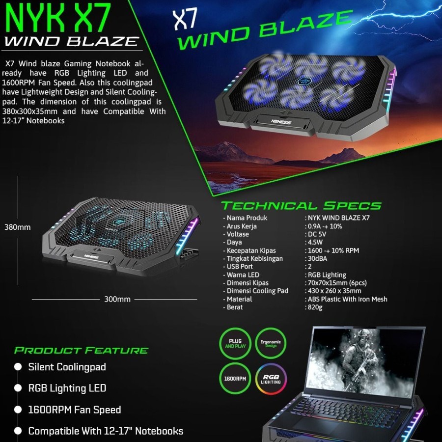 Specs : - Nama Produk : NYK WIND BLAZE X7 - Silent Coolingpad Design - RGB Lighting LED - Compatible 12-17″ Notebooks - Adjustable Height and Speed - Arus Kerja : 0.9A -+ 10% - Voltase : DC 5V - Daya : 4.5W - Kecepatan Kipas : 1600 -+ 10% RPM - Tingkat Kebisingan : 15dBA - USB Port : 2 - Warna LED : RGB Lighting - Dimensi Kipas : 70x70x15mm (6pcs) - Dimensi Cooling Pad : 380 x 300 x 35mm - Material : Iron Mesh - Berat : 820g