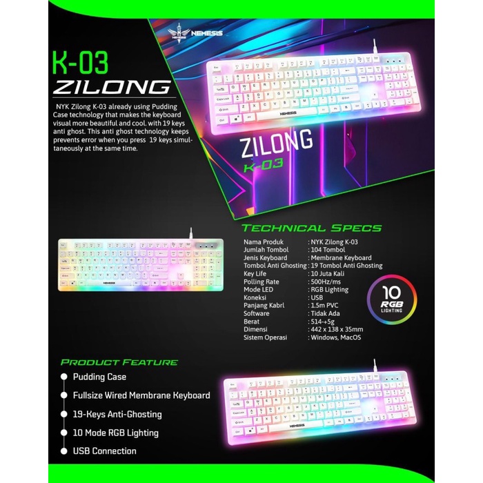 - Fullsize Keyboard 104-keys (keyboard Fullsize dengan minimalis design) - Pudding Case Full RGB Light (design case mirip seperti pudding membuat warna RGB terlihat dari segala sisi) - RGB Backlight 10 Modes (mode lampu hingga 10 modes dan dapat di ubah dengan cara FN+Scroll Lock) - Membrane Keyboard (menggunakan rubber dome jelas tidak menurunkan sisi resposif nya) - 19-keys Anti-Ghosting (mencegah kesalahan pada kombinasi tombol yg di inginkan, ketika menekan beberapa tombol secara bersamaan dan didukung hingga 19 tombol) - Key Life Expectancy (tombol-tombol yang dapat di pakai hingga 10 juta kali klik atau setara 5-10 tahun pemakaian normal) - XDA Keycaps Designed (tampilan unik dari model tombol dan juga nyaman digunakan dalam mengetik dan bermain game) - Windows Lock (sudah terdapat windows lock lebih bebas dari gangguan typo) - Usb PVC Cable 1.5m (kabel cukup panjang untuk meja setup yang besar) Weight 514±g Dimension 442x138x35mm
