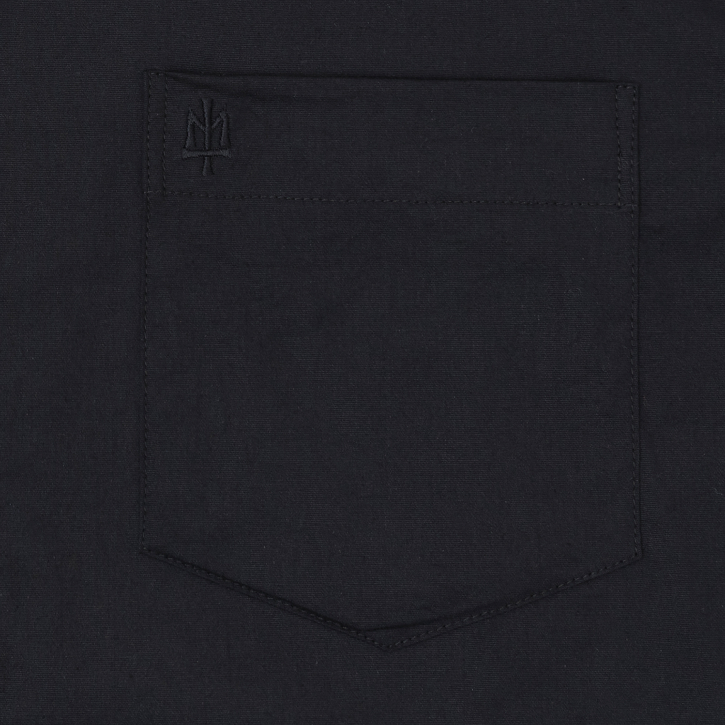 Black cotton stretch short sleeves button-ups shirt with black plastic buttons and black direct embroidery.
