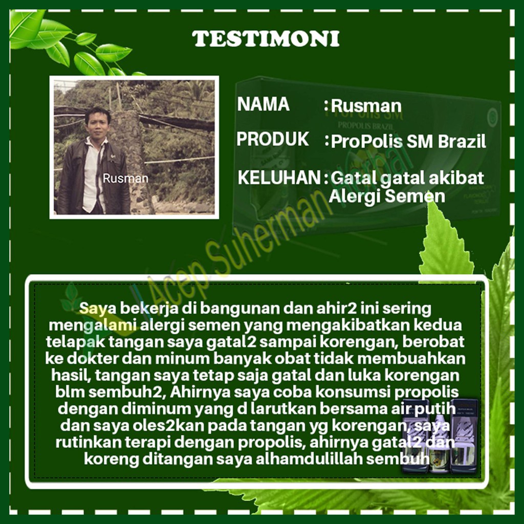 Keterangan Produk : Nama : Propolis SM Brazil Isi : 6 ml Aturan pakai : *) 2-3 tetes (menjaga kesehatan) *) 4-5 tetes (pengobatan) Legalitas : POM TR 193624961 dan Halal MUI