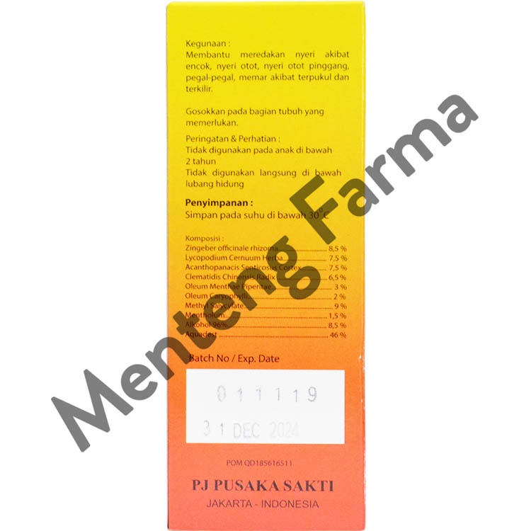 enjelasan Singkat : - Membantu meredakan sakit otot, pegal linu, keseleo, terkilir, encok (rematik), sakit pinggang, dan kesemutan - Mengurangi pembengkakan otot dan persendian - Dapat melemaskan otot yang kaku - Meredakan gejala masuk angin