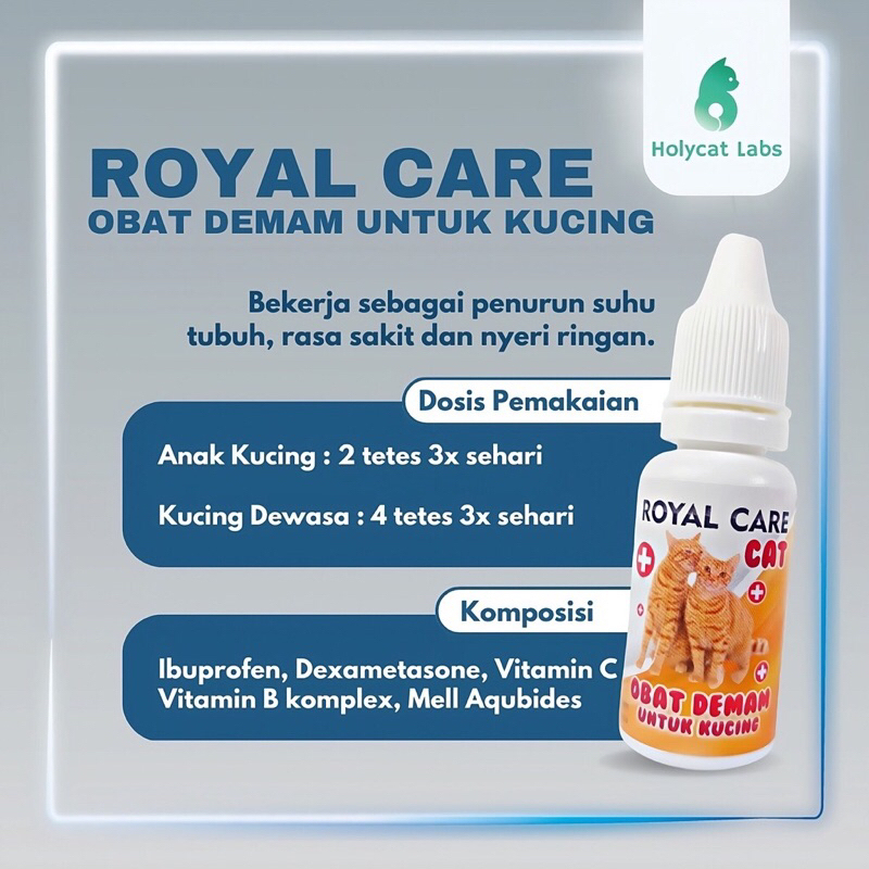 Kucing kamu gak nafsu makan, terlihat kelelahan dan kurang aktif? bisa jadi kucing kamu demam loh! Demam pada kucing bisa sangat mengkhawatirkan dan membuat mereka merasa tidak nyaman. Jika kucing mengalami masalah demam, segera berikan pengobatan atau suplemen untuk mengatasi masalah tersebut. Royal Care Demam kucing adalah 0bat yang diformulasikan secara khusus untuk menekan perkembangan bakteri, dan mengobati demam anabul.
