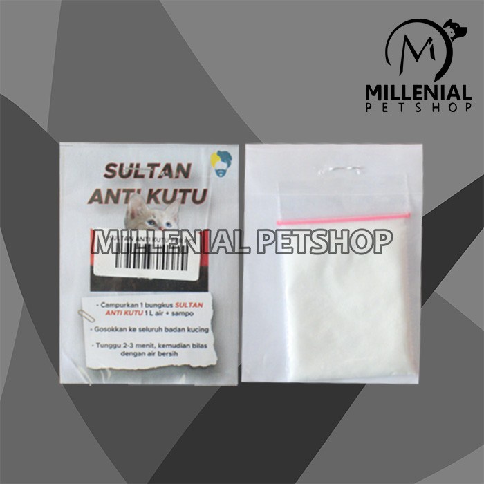 Cara penggunaan: - Campurkan 1 bungkus Sultan anti kutu dengan 1 Liter air + shampoo - Gosokan ke seluruh badan kucing - Tunggu 2-3 menit, kemudian bilas dengan air bersih