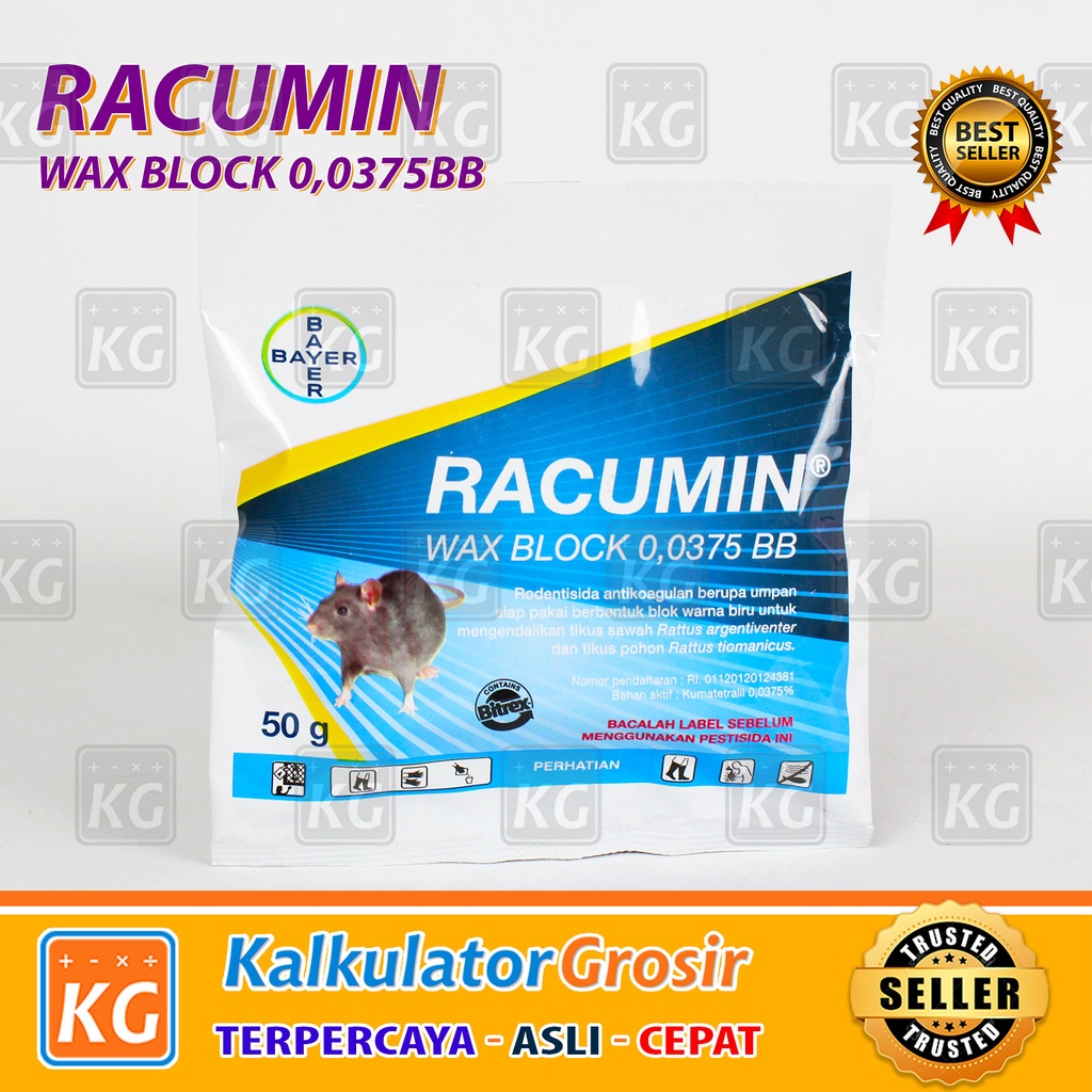 Bahan aktif : Coumatetralyl ( Kumatetralil ) 0,0375% Nomor Pendaftaran Racumin Wax Block : RI.011020120124381 Formulator Racumin Wax Block : Bayer Indonesia
