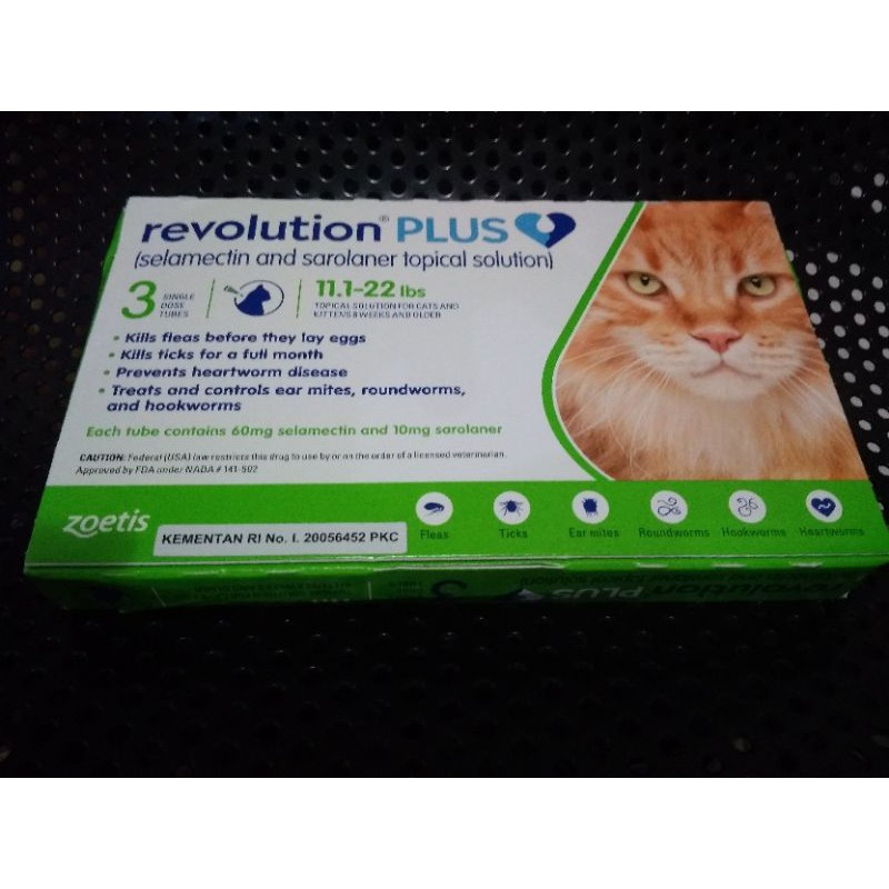 (Harga untuk satu tube) What is Revolution Plus? Revolution Plus is a safe and effective monthly topical medication that provides 6-in-1 protection for cats. Revolution Plus kills fleas before they lay eggs, and kills ticks for a full month. In comparison to Revolution for cats, Revolution Plus kills 3 types of ticks (black-legged tick, Gulf Coast tick, and American dog tick) for a full month. It also prevents heartworm disease and treats and controls ear mites, roundworms, and hookworms. Revolution Plus is easy to apply and is a quick-drying solution for a mess-free administration. Revolution Plus requires a prescription from your veterinarian.