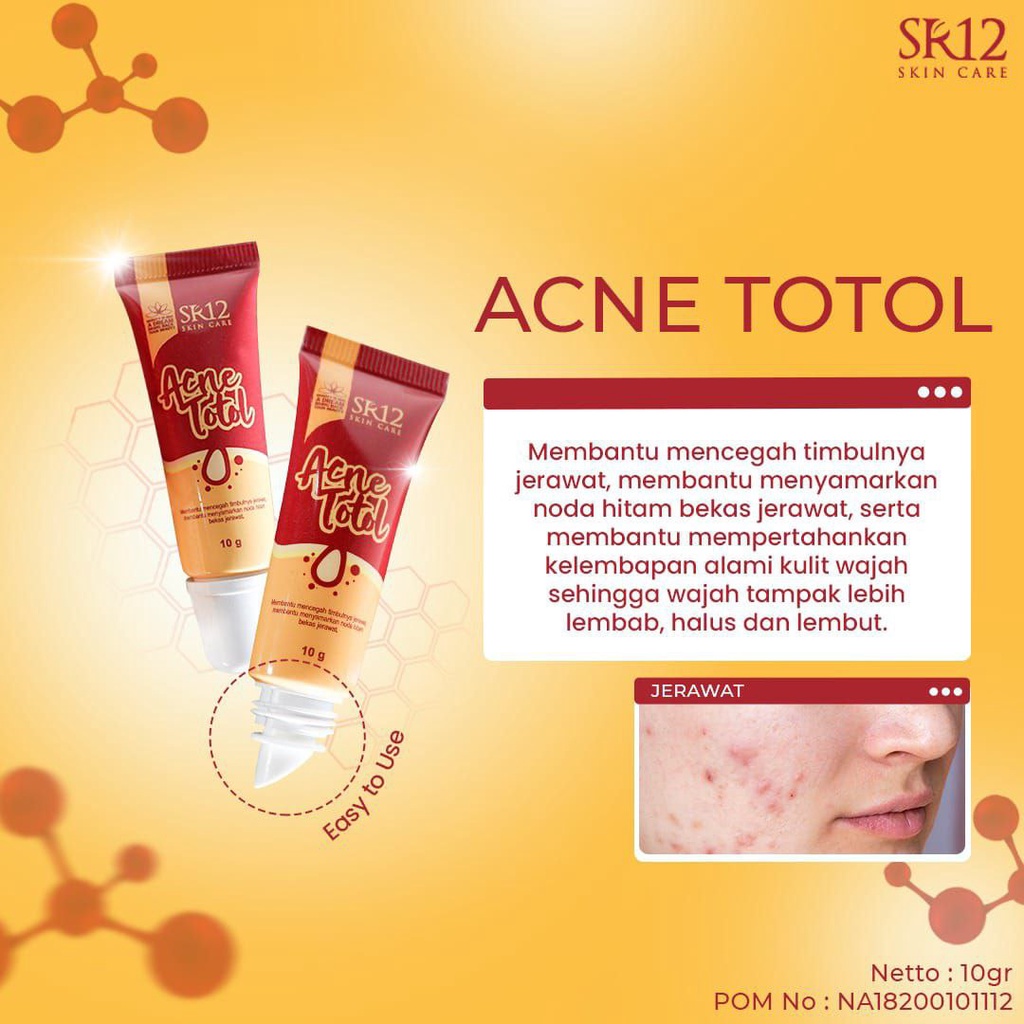 Acne Totol SR12, Treatment Obat Totol Jerawat Dan Penghilang Bekas Jerawat. Mengandung Sulfur, Salicylic Acid yang membantu proses penyembuhan jerawat. Formulasi dilengkapi dengan Allantoin, Vit C sebagai anti iritasi dan antioksidan untuk menetralkan radikal bebas, sehingga membantu menjaga kulit tetap sehat dan mencegah kerusakan sel kulit wajah.