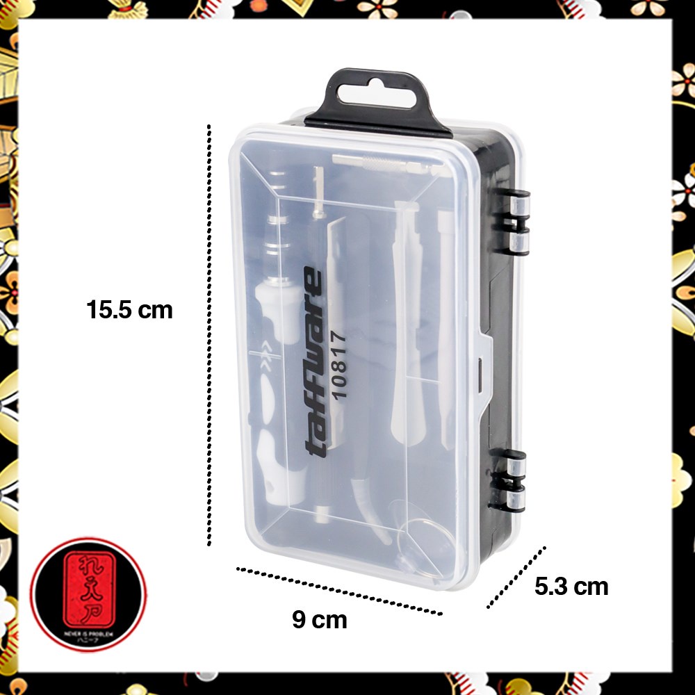 1 x Handle Obeng 1 x Ekstensi Fleksible 1 x Ekstensi Bar 1 x Tweezer Pinset 3 x Alat Pembuka Bodi Gadget 1 x Pin Pembuka SIM Card 1 x Magnetizer 1 x Suction Cup 6 x Pick Opening 1 x Holder Mata Obeng 98 x Mata Obeng 1 x Kotak Organizer Spesifikasi Material Mata Bor: Baja CR-V Handle dan Aksesoris Pembuka: Plastik Dimensi Ukuran Kemasan Kotak: 15.5 x 9 x 5.3 cm