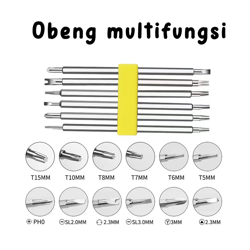 Obeng set 6 in 1 Hp full set Obeng Panjang :9.9cm Obeng set 6 in 1 sangat berguna untuk anda yang suka membongkar atau memperbaiki barang. dengan 6 stik dan total 2 kepala setiap stik membuat obeng memiliki 12 kepala yang berbeda. Anda tidak perlu lagi membawa banyak obeng, cukup membawa ini. 1 obeng dengan banyak kepala. terbuat dari bahan paduan baja yang tidak berkarat dan penyambung kepala magnetik yang kuat
