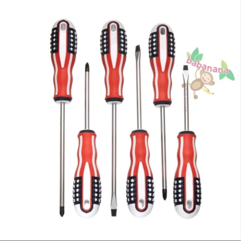 - Isi : 1 set obeng amerika bolak balik ( - dan +) - Packing : No paking - Material : Karet & Besi - Fungsi : * Model USA/Amerika bisa bolak balik memudahkan dan lebih ekonomis karena tidak perlu repot membawa obeng (-) dan (+), * model yang unik sangat praktis dan cocok untuk anak muda hingga orang tua. * Bergerigi berfungsi lock mata obeng dengan gagang dan bisa di atur panjang pendek.
