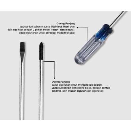 Obeng Panjang terbuat dari bahan material Stainless Steel awet dan juga kuat dengan 2 model Plus(+) Minus ( - )dapat digunakan untuk berbagai macam situasi. Obeng Panjang dapat digunakan untuk menjangkau bagian yang sulit diraih oleh obeng biasa, dengan bentuk dinamis lebih mudah diputar saat digunakan. HARGA YANG TERTERA ADALAH UNTUK PER PCS
