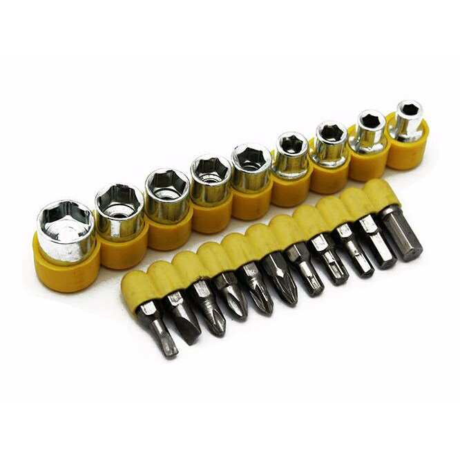 Professional 24 Pieces Socket & Bits Set Include T Screwdriver Handle 25mm Bits, Plus 1 , 2, 3 , 4.5mm, 7mm, T 10, T 15, T 20, T 25, T 30,1/4 Adaptor1/4 DR Socket: 4 , 5, 6, 7, 8, 9, 10, 11, 12 mm Ideal for home and workshop use Firm grip Easy carrying Indispensable